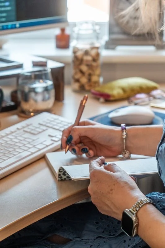 A person's hands writing on a notepad at a desk with a keyboard, mouse, candles, a jar of corks, and a banana on a windowsill in the background.