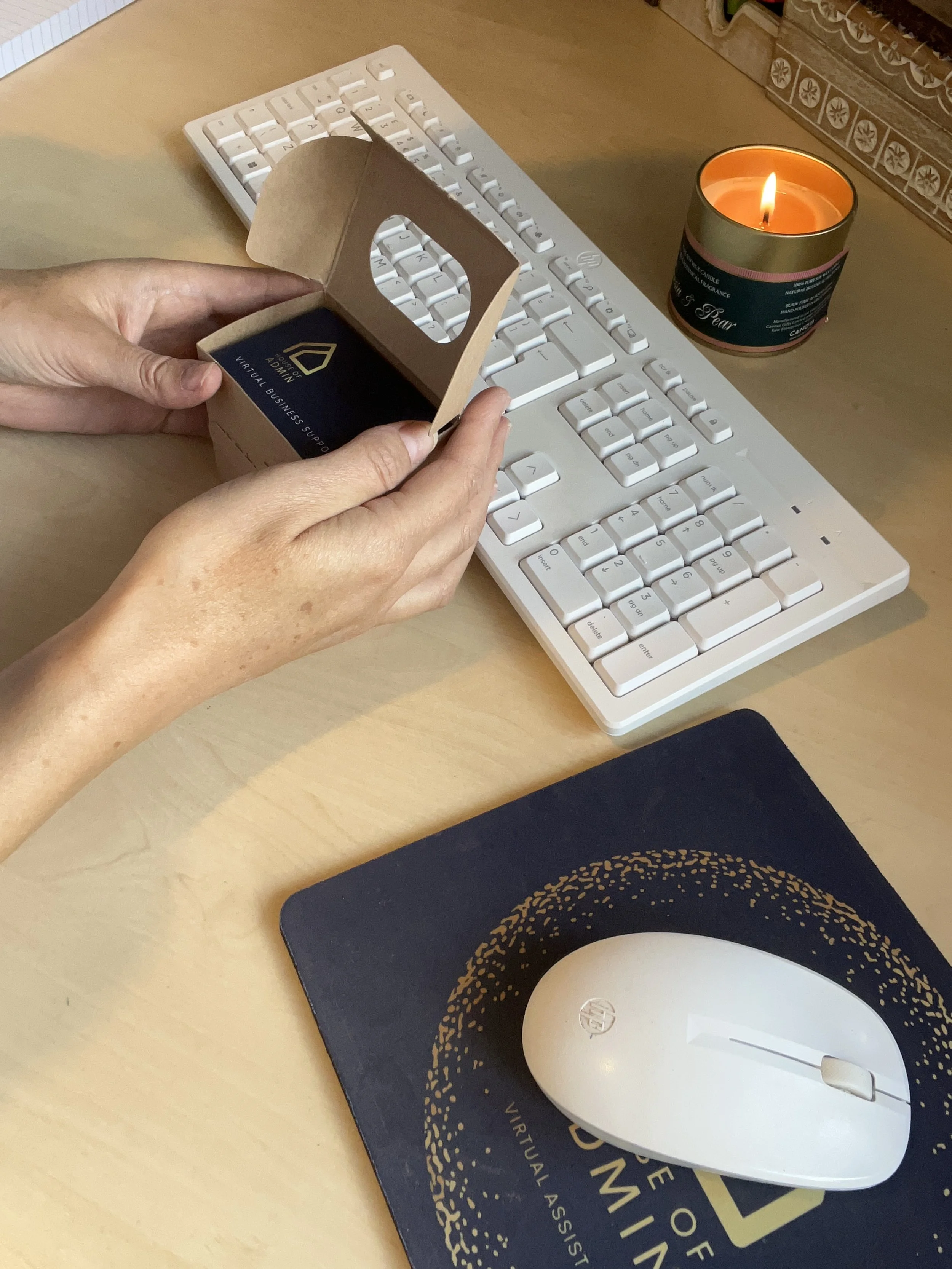 Person holding a cardboard box over a white computer keyboard on a wooden desk, with a lit candle, a white computer mouse on a black mouse pad, and a cardboard box in the background.