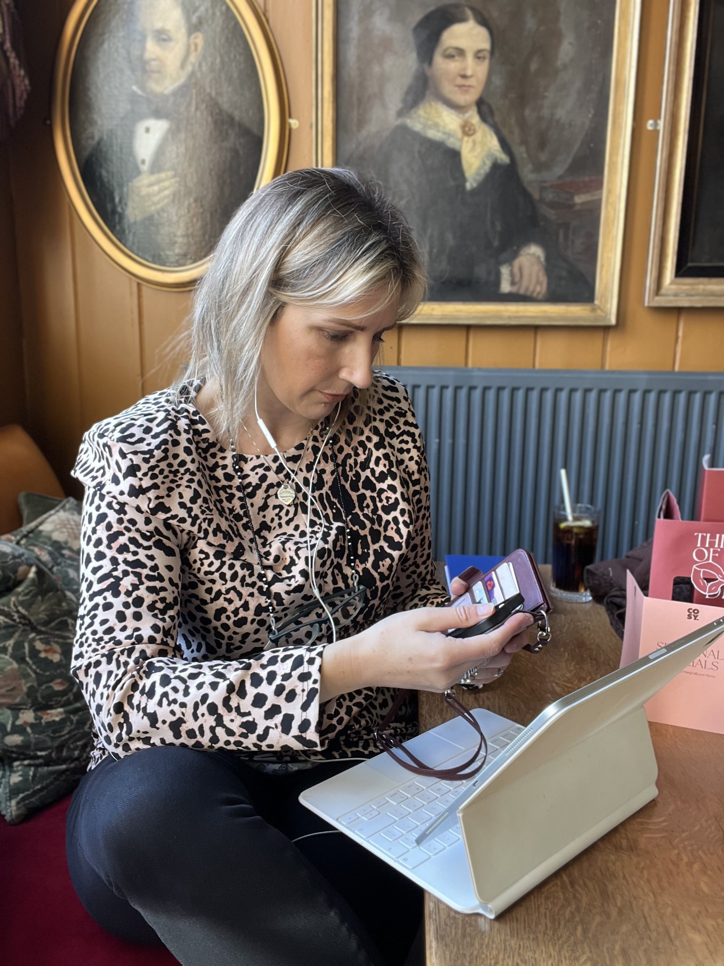 A woman with blonde hair wearing a leopard print top, sitting at a table with a laptop, using her smartphone, with a drink, shopping bags, and framed portraits behind her.