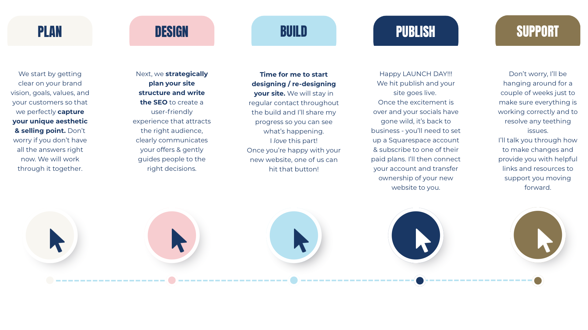 I work 1:1 with clients and you’ll have direct access to chat with me over WhatsApp and email. I’m a huge supporter of empowering women to be - not just successful, but equally - happy and healthy in life and work. I believe we can have both when we have the right support and systems in place. This is why having a website (and email list) are so important, because they take away some of that daily pressure - by answering questions when you’re not in the room - allowing your precious time and energy to be spent on the real passion and joy at the heart of your business.